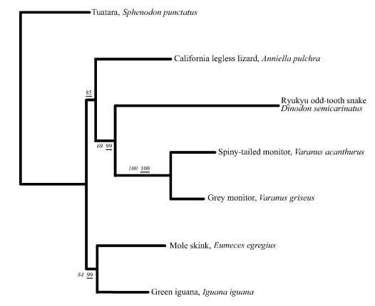 Figure 2: Optimal phylogenetic hypothesis for representatives of seven lineages of reptiles focusing on relative placement of snakes (e.g., Dinodon) using tuatara (Sphenodon) as an outgroup and a Bayesian inference approach. For this figure, branch lengths are calculated using a GTR+gamma model, with a dataset including two protein coding genes and eight tRNAs from mitochondria. Numbers in italics are nonparametric bootstrapped Bayesian posterior probabilities (BPP) based on 100 replicates and 200,000 generations. Bayesian posterior probabilities (PP) for nodes are underlined (from Rest et al. 2003).